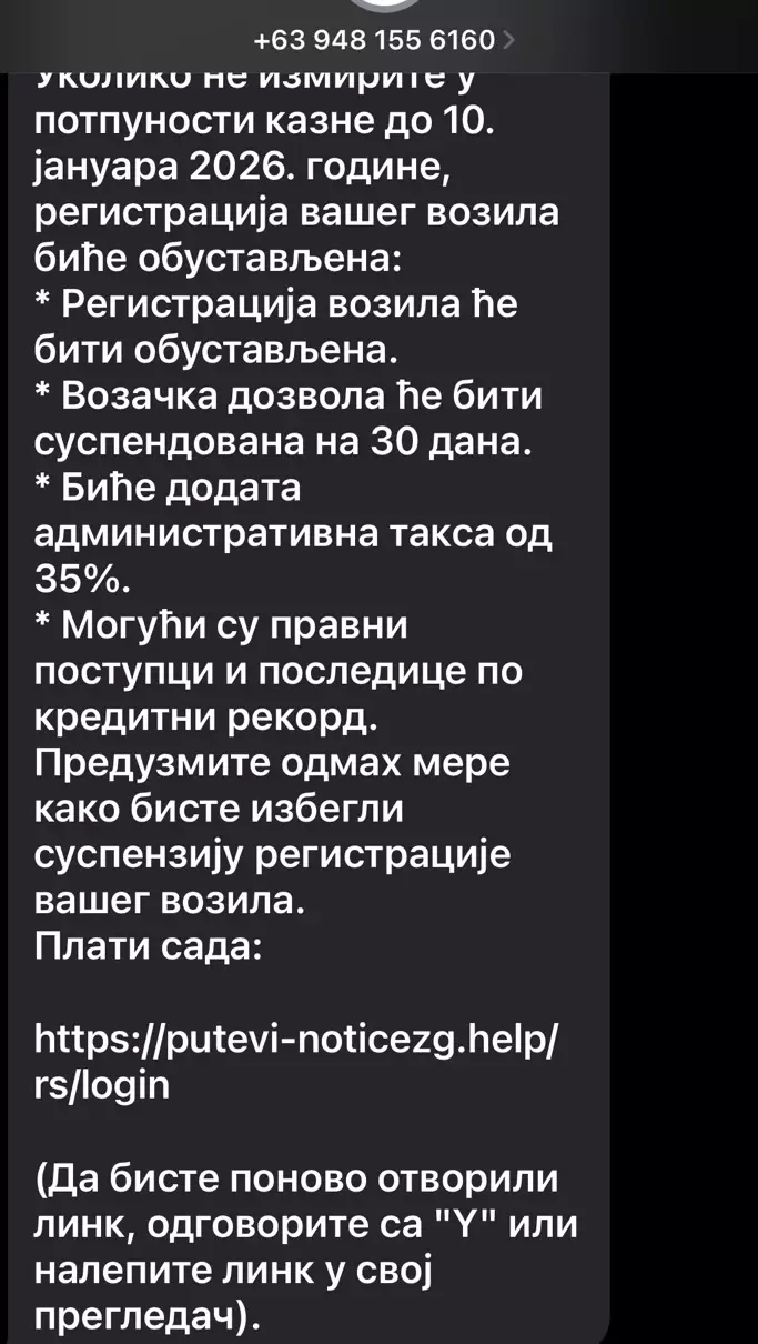 Број с ког порука стиже долази са Филипина, а у поруци се тражи да се измире хитно обавезе, пошто ће „Министарство саобраћаја Републике Србије” почети „извршење казнених мера” од 13. јануара.
