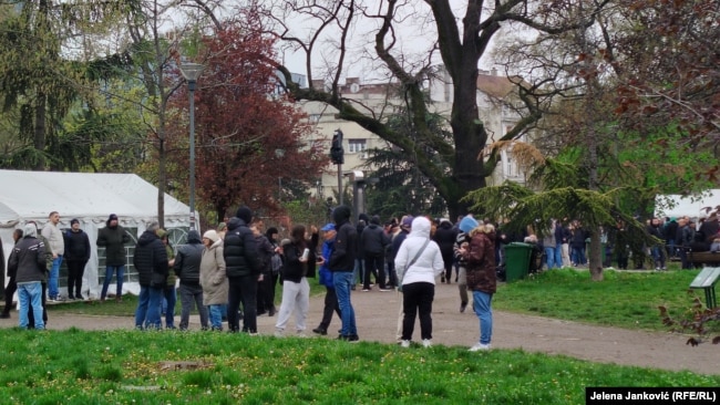 За време протеста новинарских удружења испред зграде Председништва, велики број људи окупио се недалеко одатле у шаторском насељу у Пионирском парку где бораве присталице власти.