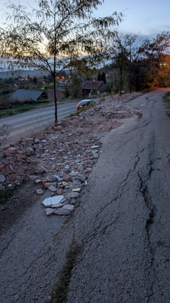 Проблем се одвија у улици Београдска други део, која је већ годинама угрожена због клизишта које је оштетило пут. Како се види на фотографијама које су нам мештани доставили, велика количина шута, поломљених цигли, плочица и бетона истоварена је поред пута, додатно оптерећујући већ нестабилну ивицу.