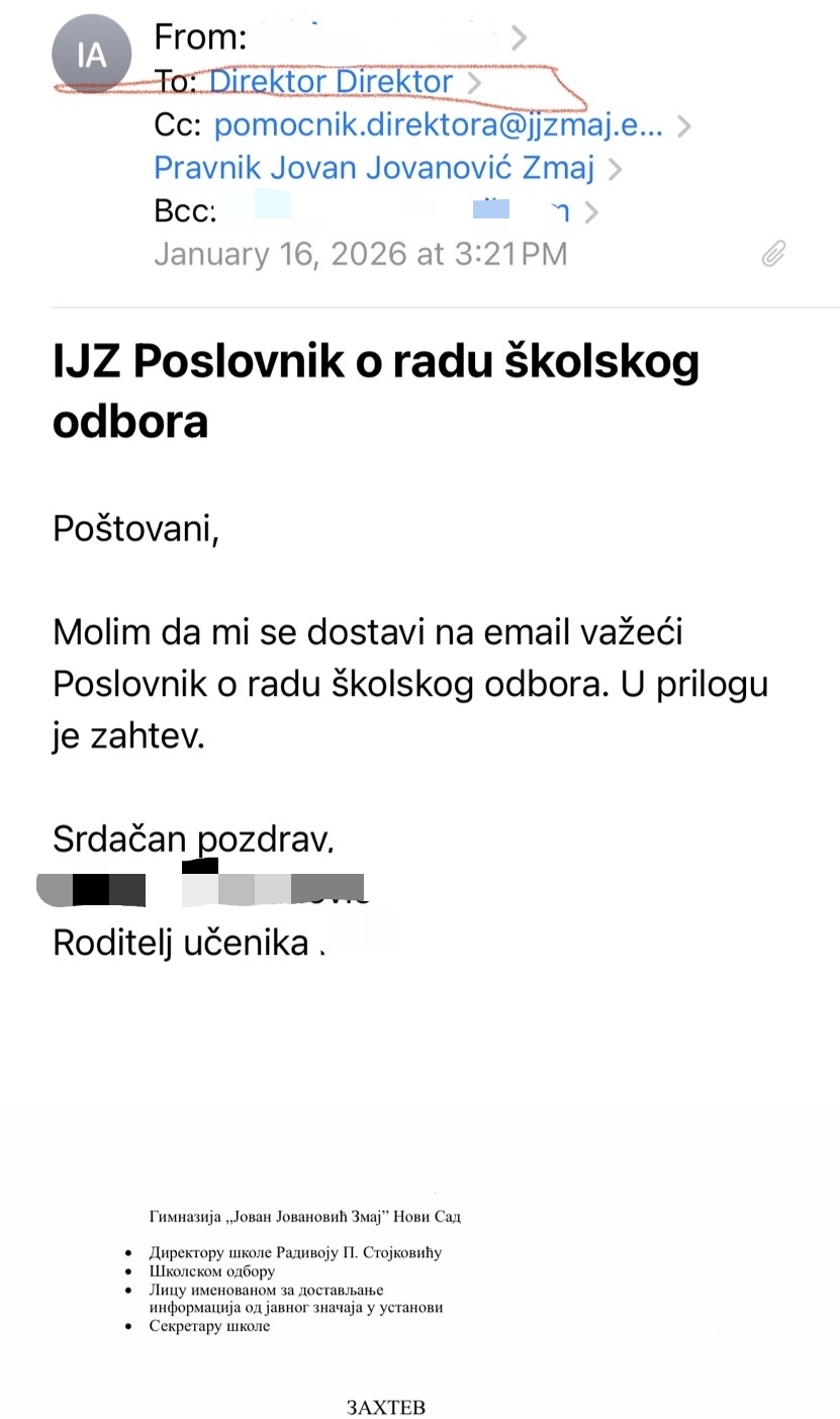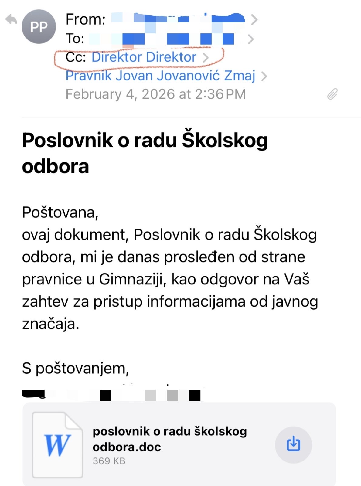 Истина је да су родитељи 16. 1. 2026. године мејлом, путем захтева за информацију од јавног значаја, тражили поменути Пословник од школе. Исти мејл је, између осталих, послат и директору. Дана 4. 2. 2026. године лице задужено за информације од јавног значаја је путем мејла проследило родитељима тражени Пословник, као и Радивоју П. Стојковићу. Дакле, директор школе је био обавештен о свему и свесно је покушао да обмане јавност преко званичног сајта гимназије.