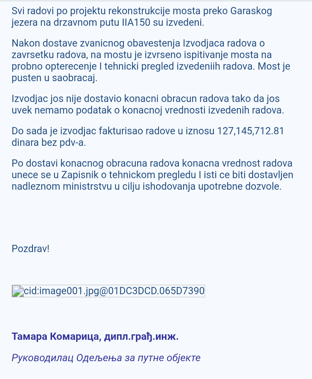 Питања која смо поставили том приликом Путевима Србије била су врло јасна – колико је грађане коштала реконструкција моста и да ли мост поседује сву потребну документацију да би био пуштен у саобраћај?